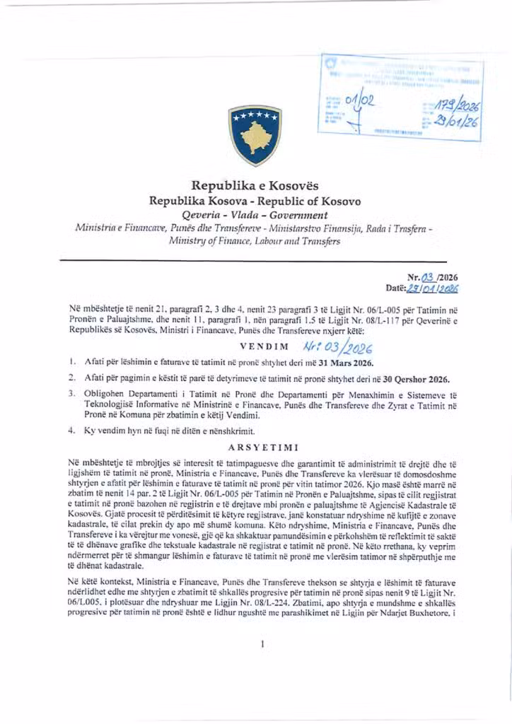Kosova Maliye, Çalışma ve Transferler Bakanılığı’nın 29.01.2026 tarihli kararı doğrultusunda, emlak vergisine ilişkin süre uzatımları aşağıdaki şekilde belirlenmiştir: